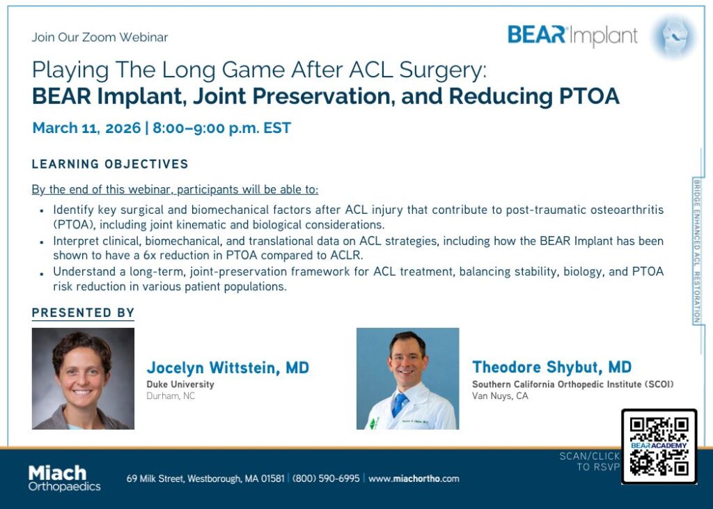 Mark your calendar for our next BEAR Academy webinar, “Playing the Long Game After ACL Injury: The BEAR Implant, Joint Preservation and Reducing PTOA vs ACLR.” Hear from Dr. Jocelyn Wittstein and Dr. Theodore Shybut, who will address the reality of PTOA after ACL injury and reconstruction, review the biological and biomechanical drivers of PTOA, and discuss how ACL preservation with BEAR may influence long-term knee health and surgical decision-making.